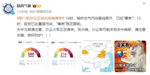 3月18日下午,陕西气象发布提醒,新一轮沙尘正自北向南袭来。到今晚,沙尘有可能到达关中南部,大家请注意关窗,做好防护!
