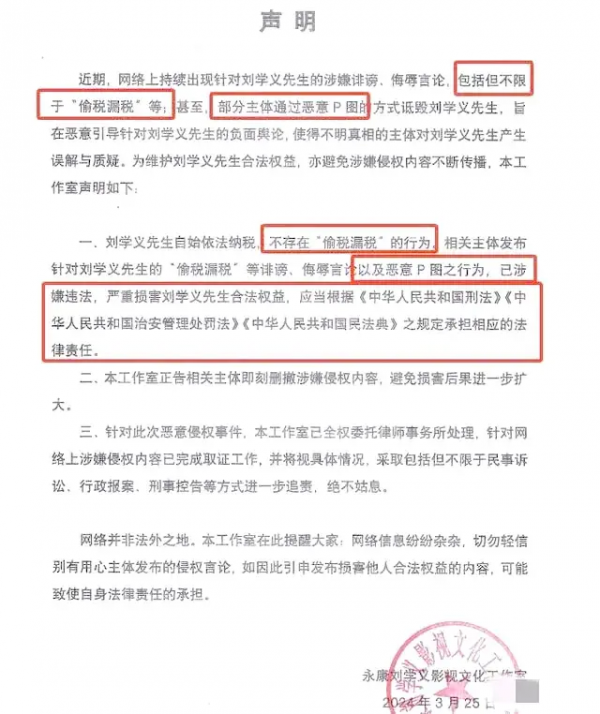 3月25日,刘学义工作室发布正式声明,针对网络上关于刘学义偷税漏税的传闻予以坚决否认。声明中明确表示,刘学义自始至终依法纳税,不存在任何形式的偷税漏税行为。同时,工作室已完成对网络上涉嫌侵权内容的取证工作,并保留采取包括民事诉讼、行政报案、刑事控告等方式进一步追责的权利。这一声明的发布,旨在澄清事实,保护刘学义的合法权益,并对侵权行为进行追责。刘学义的塌房事件:刘学义的走红并非一帆风顺。近期,他因涉嫌不当言论和偷税漏税问题被推上了风口浪尖。尽管他的工作室迅速发布声明澄清偷税漏税的争议,但对于不当言论的问题却并未给出明确回应。这让他的粉丝们感到失望,同时也引发了公众的质疑。