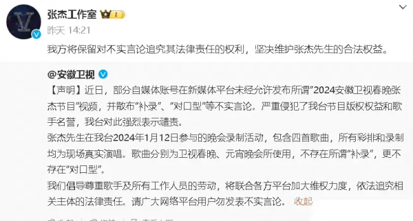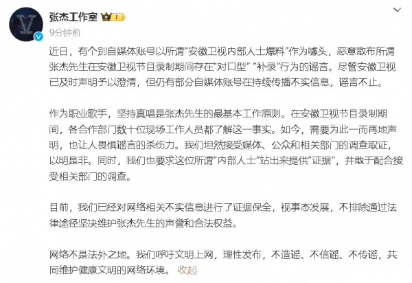 张杰工作室声称:"作为职业歌手,坚持真唱是张杰先生的最基本工作原则。"张杰工作室同时也称已进行证据保全,不排除通过法律途径维权。就在这之前,安徽卫视也就此网上的相关传闻发表过声明。