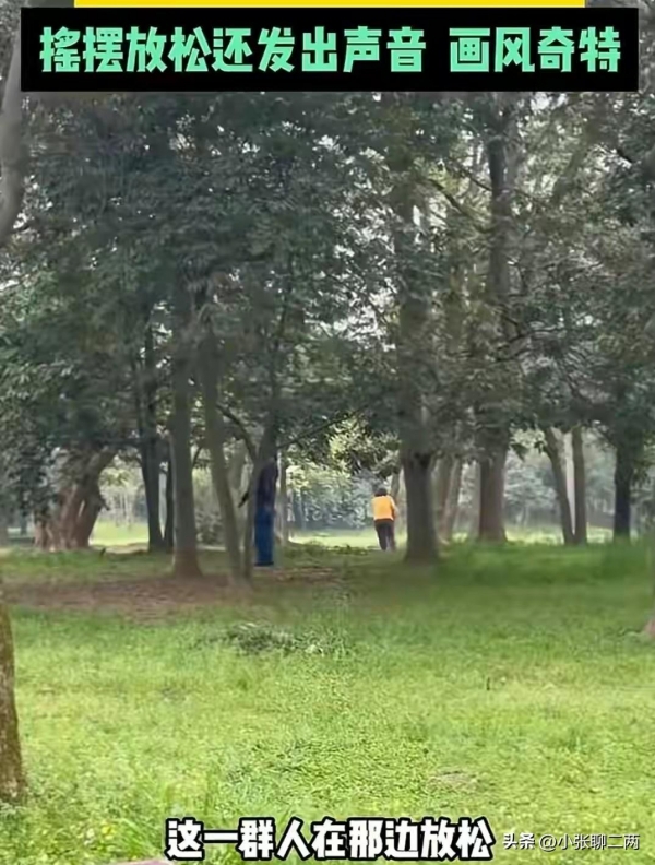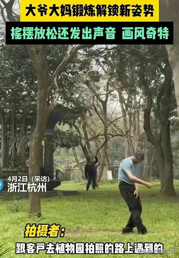 近日,浙江杭州有网友在公园看到四五个大爷大妈锻炼,用出了新姿势。摇摆放松,还发出各种声音,画风十分奇特。