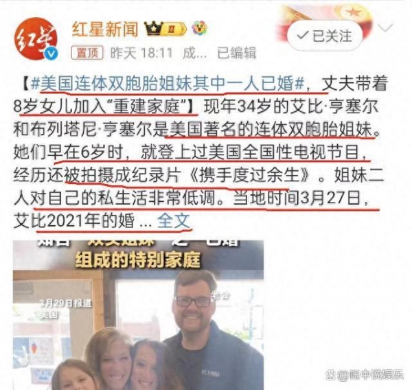 这一次,是美国当地一家媒体率先发布了不少姐妹俩的工作照片,还首次公布了艾比.亨塞尔和丈夫的结婚照片,而后才引起了中国部分媒体和网友的注意。