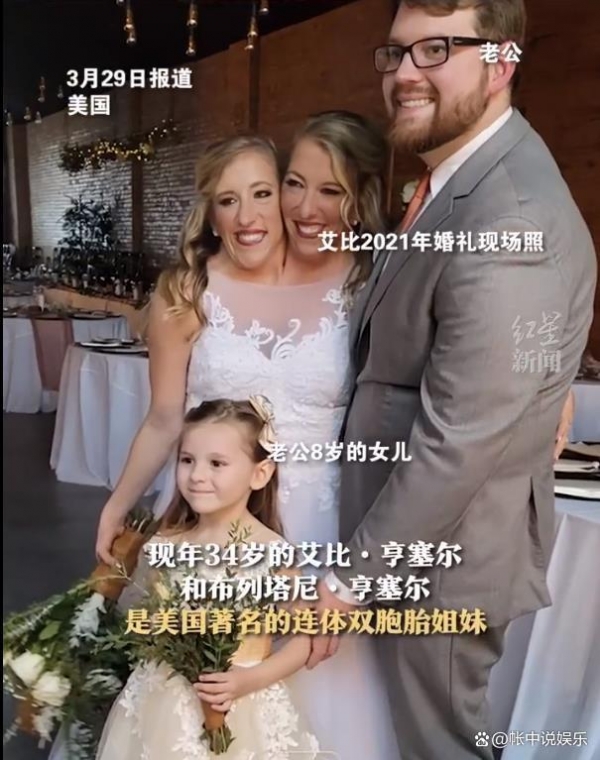 而笑的最开朗的,当属连体双胞胎姐妹中的艾比.亨塞尔了,她身穿一件纯白色的婚纱,画着精致的妆容,幸福的依偎在丈夫身边。