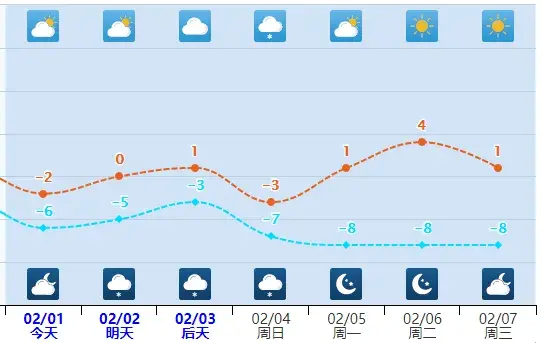 河北省气象台2024年02月01日11时发布天气预报:今天下午到夜间,保定、石家庄、邢台三个地区的西部阴有零星小雪或小雪转多云,其他地区多云。最高气温,张家口北部、承德、保定西北部-10~-5℃,其他地区-4~0℃。最低气温,张家口、承德、唐山北部、秦皇岛北部、保定西北部-21~-12℃,其他地区-11~-7℃。