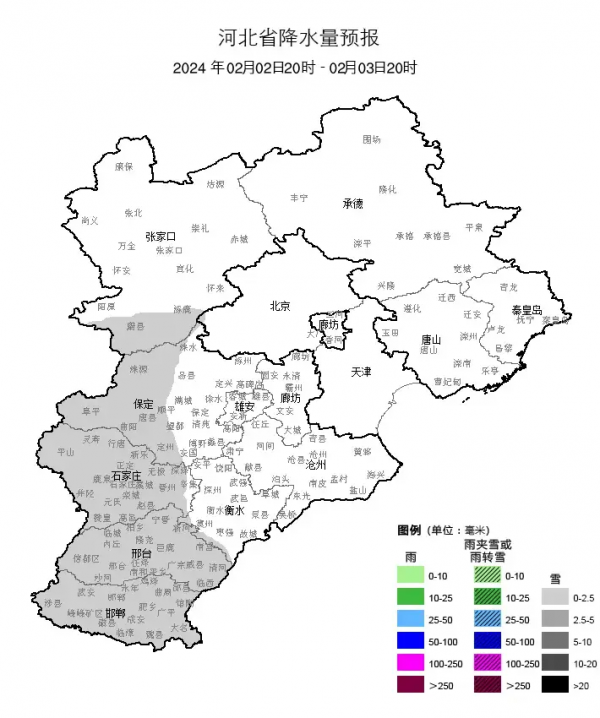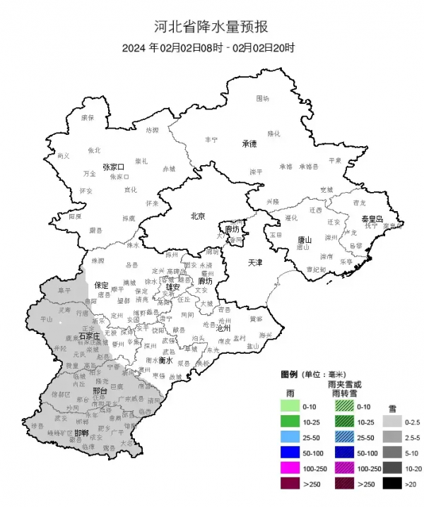 2月2日白天,保定西南部、石家庄西部、邢台、邯郸阴有小雪或零星小雪,其他地区多云。2日夜间到3日,张家口南部、保定西部、石家庄、邢台、邯郸阴有小雪或零星小雪,其他地区多云。