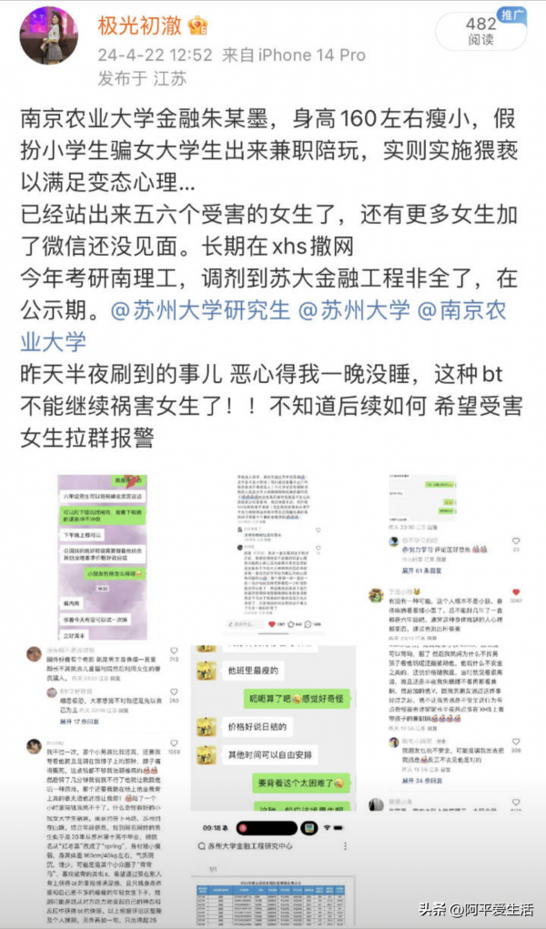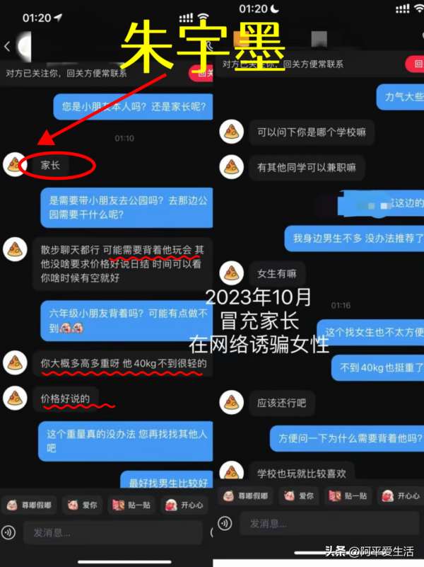 南京农大的朱宇墨,长期冒充六年级学生家长身份,在小红书上发布:招聘兼职的广告。