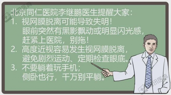 他有点害怕,马上去医院看病。眼科医生诊断是"视网膜脱离"(也叫"视网膜脱落")。幸亏来得早,还能手术治疗,否则可能有失明风险。