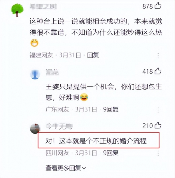 对于这个事件,不少网友也表示,"王婆说媒"其实就是不正规的婚介流程。并且王婆说媒,全凭一张嘴。这种台上说一说就能相亲成功的,本来就觉得很不靠谱,不知道为什么还能炒得这么热。所以,相亲是一件严肃的事情,还是要自己把握,千万别忘了人们常说的"王婆卖瓜,自卖自夸。"