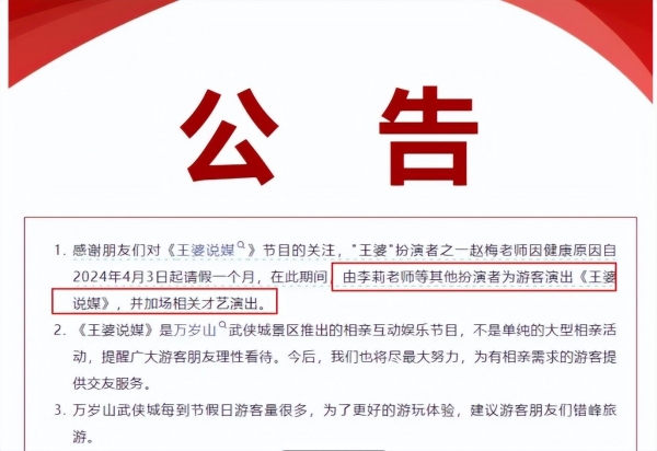 因为这件事情,"王婆说媒"活动也受到了影响,景区官方对该活动做出了改动,王婆让位。换了另一个阿姨进行该活动。从现场的情况来看,该阿姨直接在相亲台唱了起来,相亲台感觉变成了戏台了,也不知道这样的表演,后续王婆说媒该活动还能不能继续火起来。