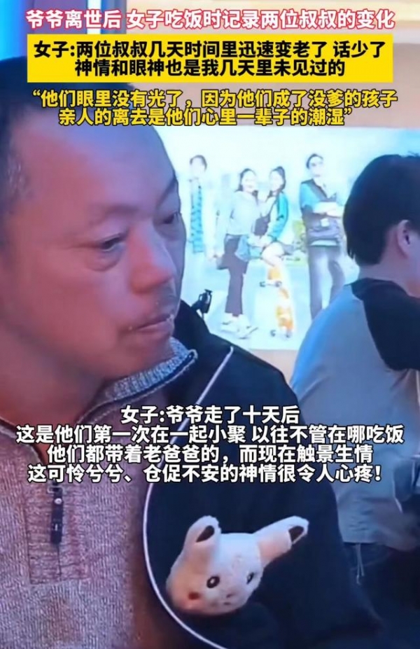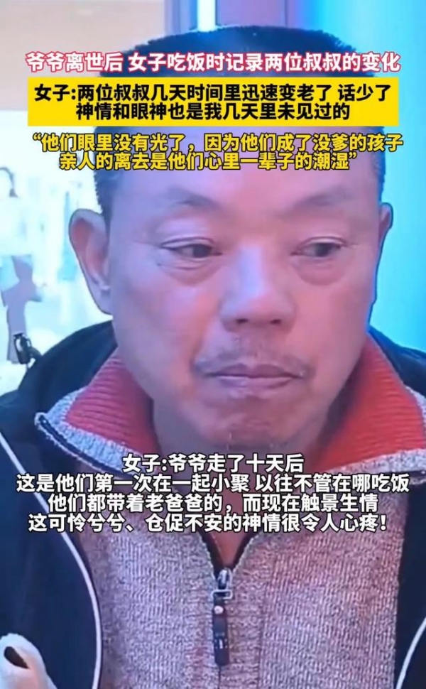 网友说:看着这两位叔叔的眼神,真的很心疼!我虽然只有三十多岁,但是已经感受过这种感觉了,前两年妈妈的去世就是我一生的潮湿,永远都忘不了的痛。真想抱抱他们。