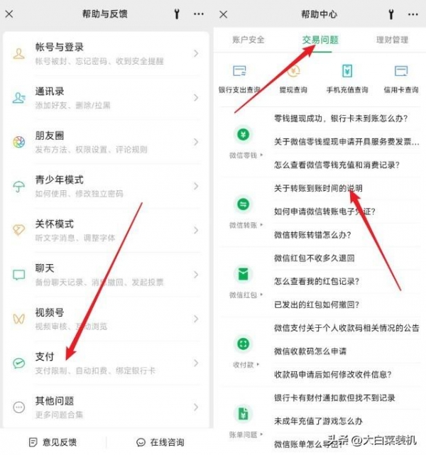 然后,在该页面找到并点击【支付】,再点击切换至【交易问题】页面,就能看到【关于转账到账时间的说明】。