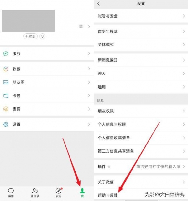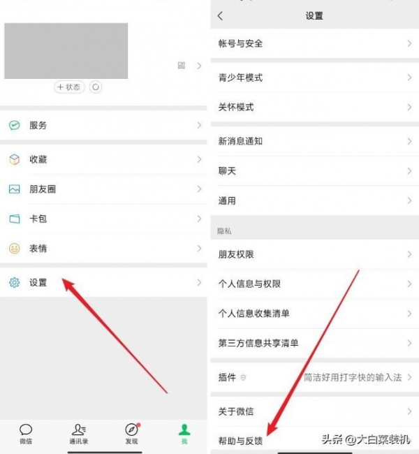 首先,进入微信【我】的界面,点击【设置】,再点击下方的【帮助与反馈】。