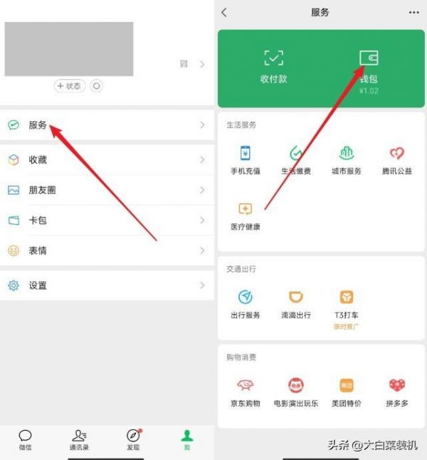 首先,进入微信【我】的界面,点击【服务】,再点击上面的【钱包】。