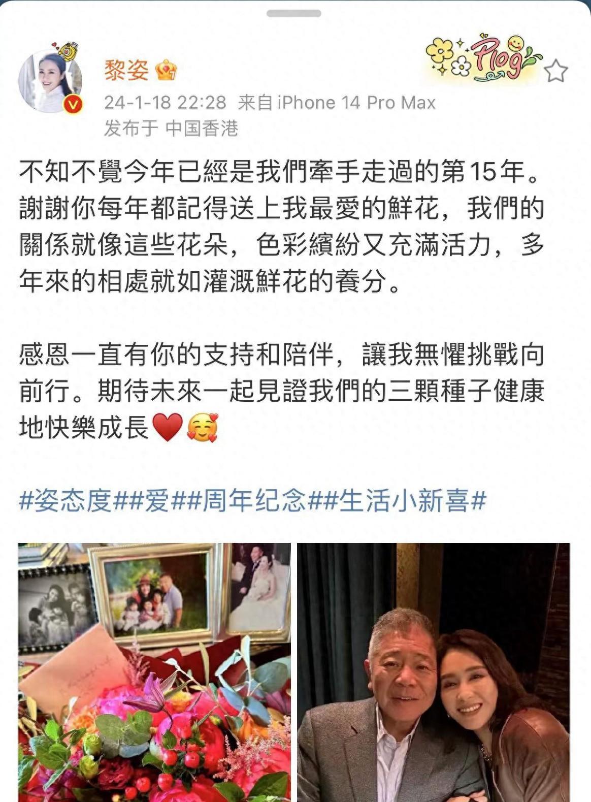 1月18日晚,女星黎姿发文庆祝结婚15周年,她晒出两张照片,一张是甜蜜的夫妻合影,另一张是丈夫送上的鲜花。