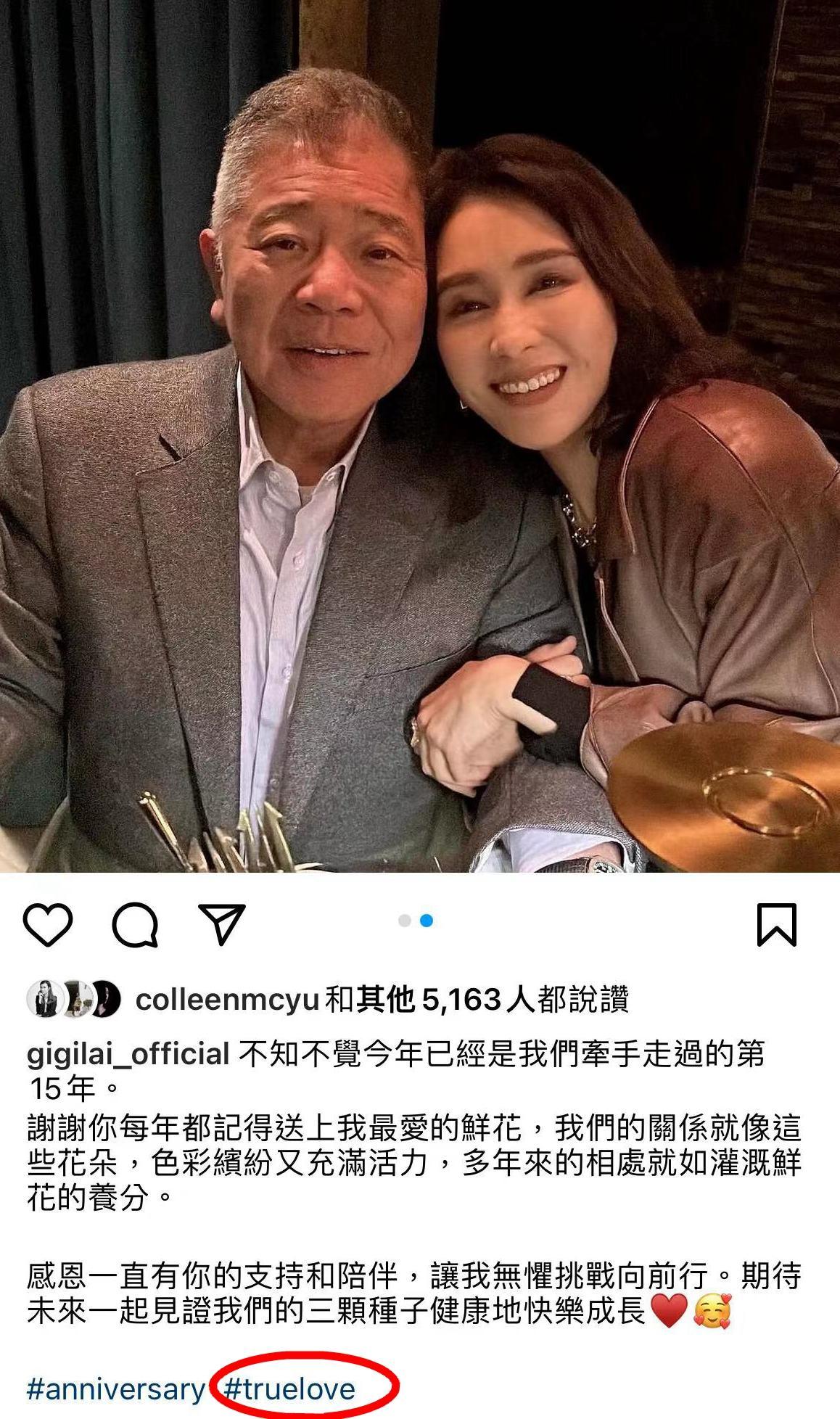 黎姿的文字很简单,她多谢老公多年来坚持在特别的日子送花,她形容这段夫妻关系就像鲜花一样,充满活力、色彩缤纷,时刻保鲜。