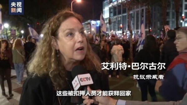 抗议示威者 艾利特·巴尔古尔:他必须停火,这些被扣押人员才能获释回家,这才是我们想要的。我们想要立即停火,我们想要他下台,在这里几千人都不再相信政府了,这个政府已不能代表我。