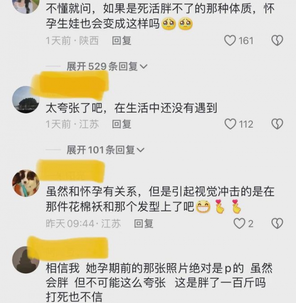 不少网友在看到这一强烈的对比之后,半开玩笑地评论道,如果仅凭那张孕后照片来判断年龄的话,说是六旬老妪也不过分。