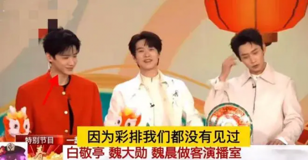 事后采访时,魏大勋和魏晨都还穿着直播时的衣服,只有白敬亭换了一身大红色衣服,并大喇喇地坐在了C位。