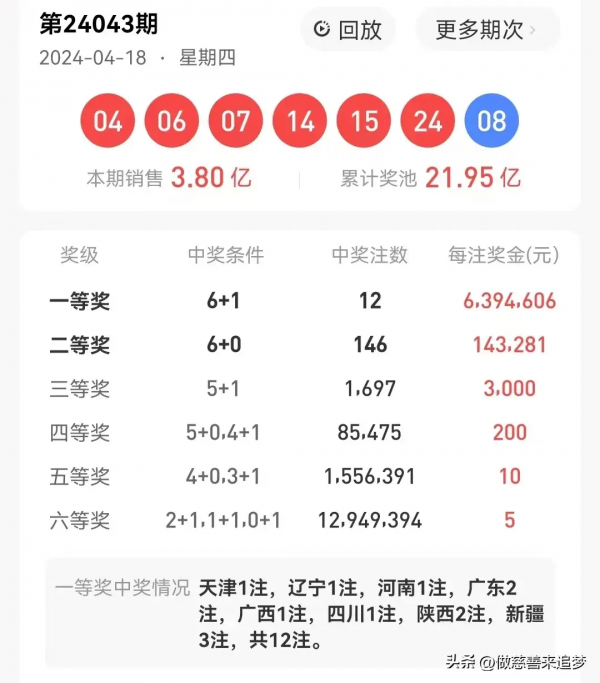 第24043期双色球共销售约3.79亿元,筹集公益金约1.36亿。总共开出12注一等奖,每注奖金是639万余元,花落8省,分别是天津1注,辽宁1注,河南1注,广东2注,广西1注,四川1注,陕西2注,新疆3注。恭喜以上得主,让小编也来接接头奖中奖者好运吧[发]