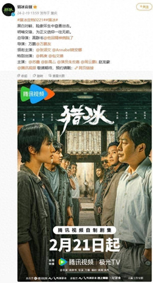 《猎冰》官博发文:"黑白对峙,险象环生中奋勇出击。明暗交锋,为正义信仰一往无前。"