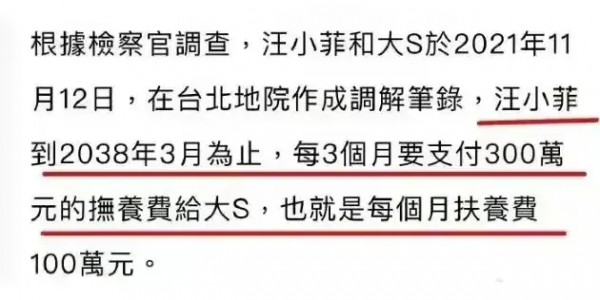 大S前段时间又把汪小菲告上了法庭,结果二人的离婚协议细节曝光,汪小菲每三个月需支付抚养费300万,每个月100万,截止到2038年,一共需支付1.8亿台币,还有十四年,面对这个天文数字,网友吐槽大S的吃相太难看。