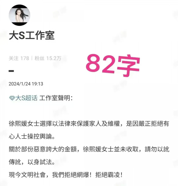 不过大S方很快发了声明,否认拿了高价抚养费,还表示只是在用正常的法律手段维护家人的权益。大S声明中丝毫不提告汪小菲事情,也是被网友指责回应的模棱两可,戏太多了。