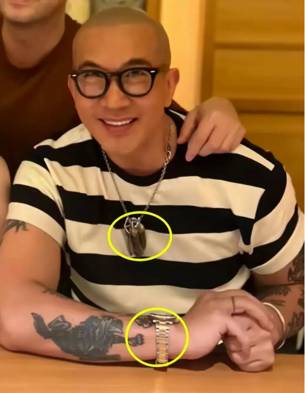 旁边的具俊晔也穿着很简单,黑白条纹T恤衫,脖子上挂着权志龙同款羽毛项链,手上戴着一块价值不菲的金表,胳膊上的文身十分抢眼,宛如一幅社会大哥大的模样。