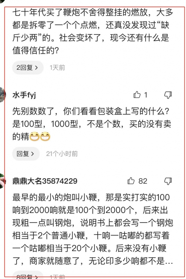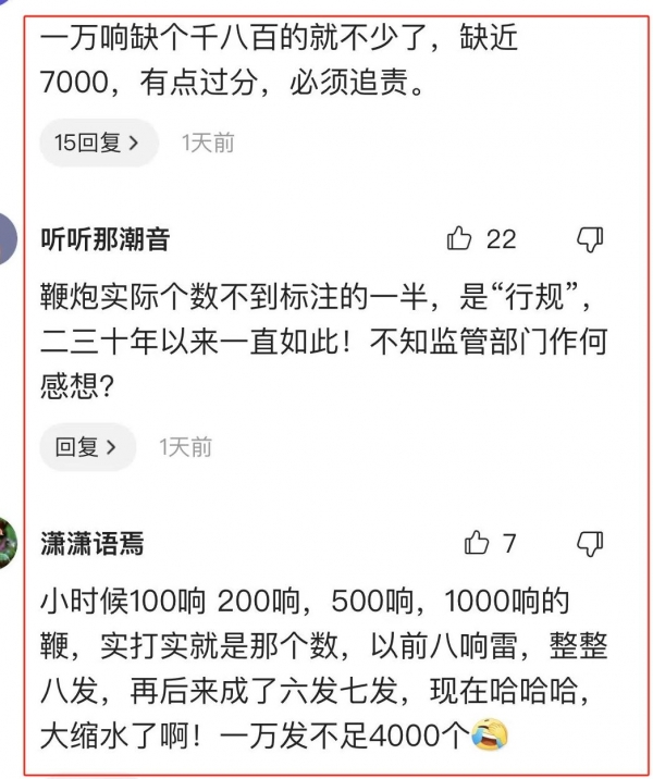 有网友说:"我们小时候的鞭炮,100响就是100响,200响就是200响,从来没有少的,讲究的是诚信,现在都没有诚信可言了。"
