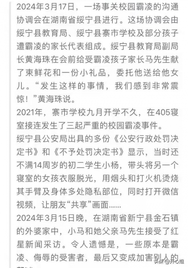 3.17日,湖南省绥宁县教育局正在组织一场特殊的沟通协调会,会议主题就是女生小马及其他同学遭学姐长期残酷霸凌的事。