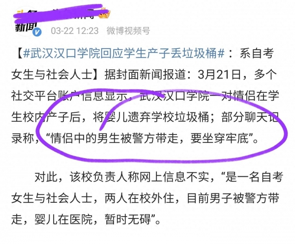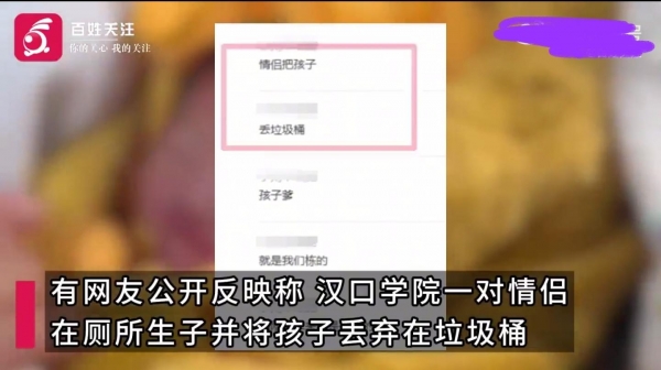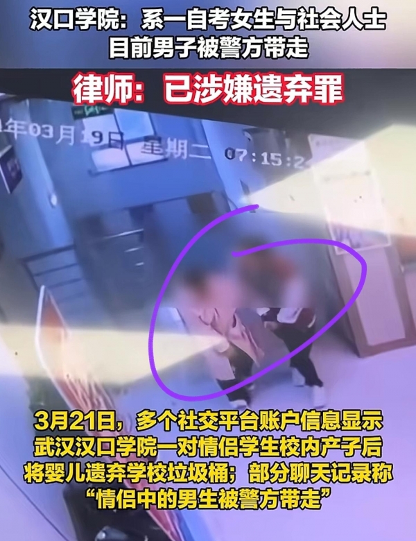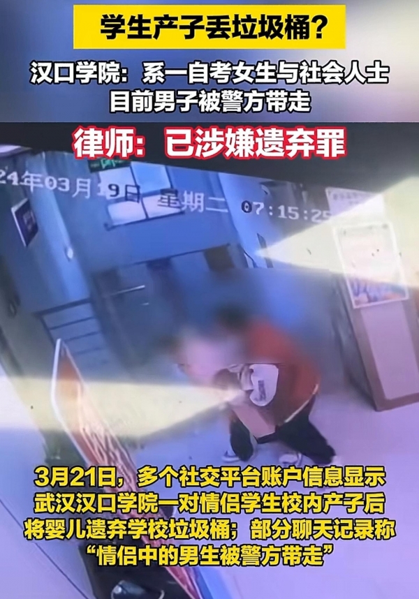 3月22日,武汉汉口学院大学生情侣,厕所产子把婴儿丢弃在垃圾桶的事件持续发酵。