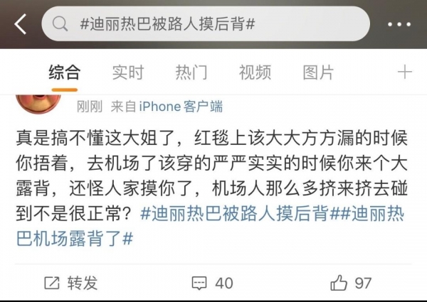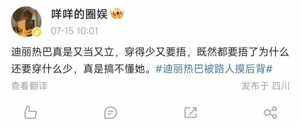 评论区里不少迪丽热巴的粉丝已经炸毛,觉得公共场合没经过迪丽热巴的允许就偷偷抚摸她的后背,这是明星的猥琐行为,别说是对明星,就是对普通姑娘,你在街上摸人家露出的皮肤就是典型的"咸猪手"。