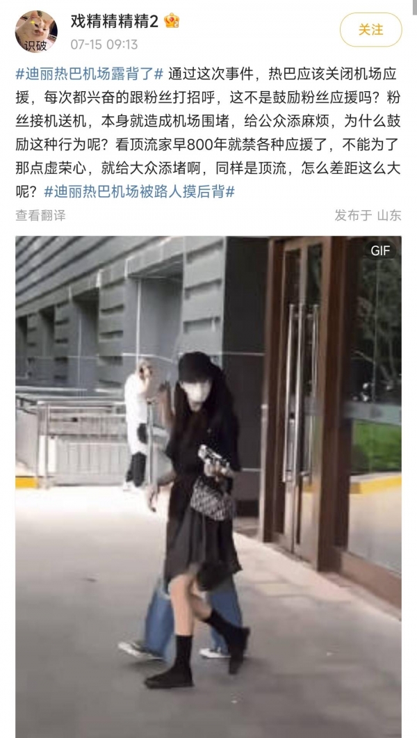 如果只是衣服漂亮的话,那么迪丽热巴还不至于上热搜,争议的地方是有陌生人在机场对着迪丽热巴"动手动脚"了。