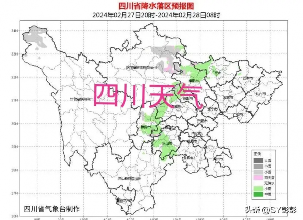 四川最新天气情况 ,2024年2月27号!白天,盆地大部阴天间多云,西北部有分散的小雨;川西高原和攀西地区多云间晴,其中阿坝州东北部有分散阵雨或阵雪。