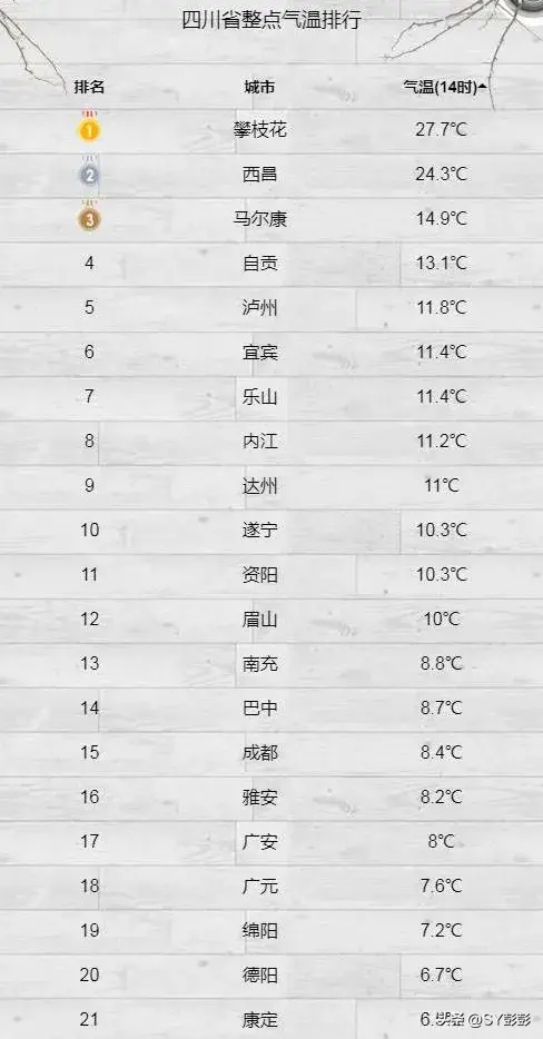 川西等高原地区的气温仍然不太乐观,最高气温为-6℃,最低气温为-14℃。川南地区气温回升变化相较川西还是很明显的,平均最高气温可达18℃,最低气温为2℃。