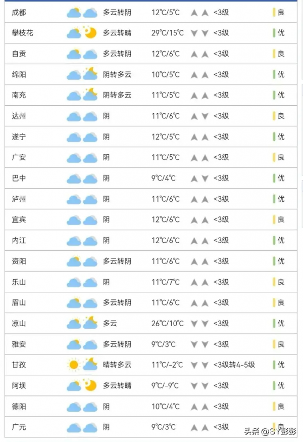 盆地大部以阴天为主,部分地方有小雨;阿坝州和甘孜州北部多阵雪(雨),局部中到大雪。虽然整体气温有所回升,但早晚温差较大,请大家注意合理添衣保暖,适时增减衣物以保持舒适。