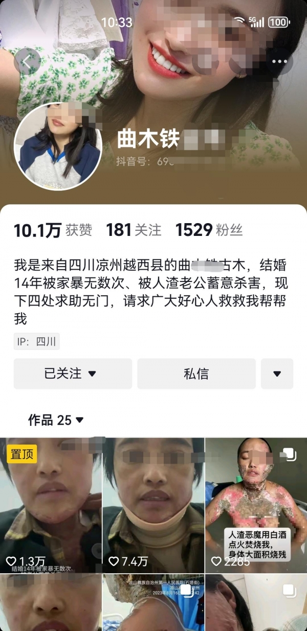 女子发布的多条视频显示,其脸部及上身部位被严重烧伤。女子在视频中自称家在四川省凉山越西县,今年36岁,和丈夫结婚14年,目前有两个小孩。去年8月14日,她在外面被丈夫殴打,之后被拽回家中。"先烧毁了我的身份证,然后他往我身上浇白酒,用打火机点燃。"女子说,丈夫不顾她的求救,冷笑着看着她在火焰里哀嚎。丈夫的弟弟随后把她送往医院救治,自己之后也报了警,没过几小时丈夫被放出来了。"警察说没有证据直接证明是我老公烧伤的我,他至今还在逍遥法外。"