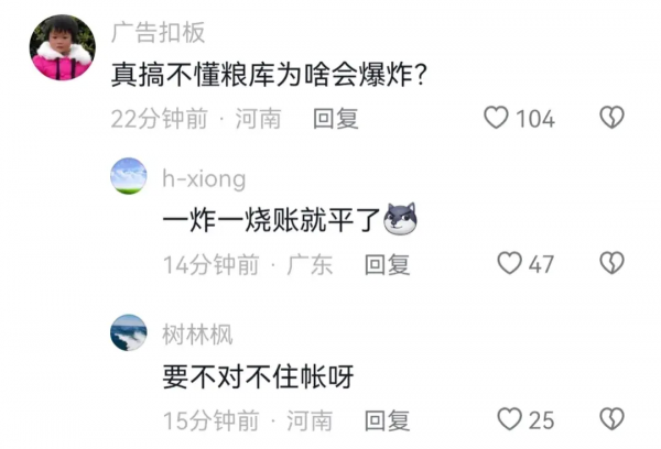 看着网友回答也是让我哭笑不得,他认为这场粮仓起火原因和电视剧中粮仓起火一样,是粮仓食物亏空,有人放火烧毁弥补亏空粮食。