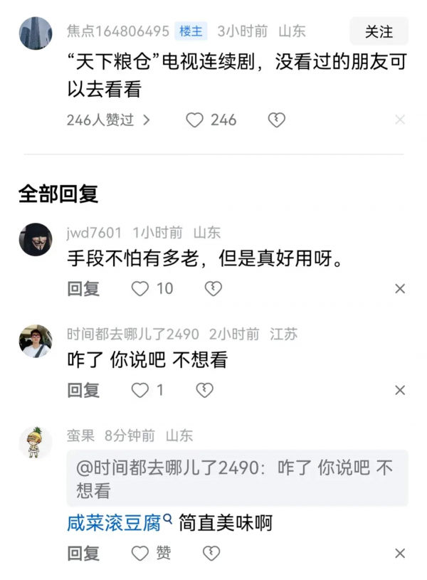 有网友给出答案是看过"天下粮仓"电视连续剧吗?