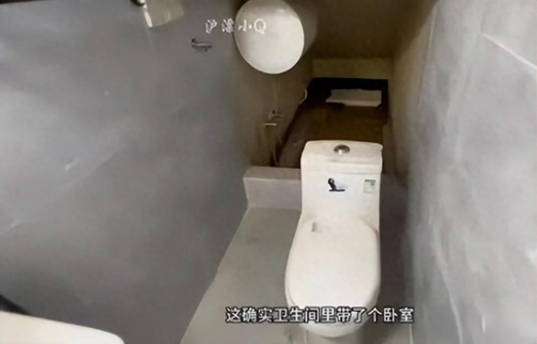 综合媒体报道,视频中,男子称房子为小楼中楼,号称是一套1室1厅1厨1卫的房子。进门左边就是一个小厨房,中间是一个下沉式的小客厅,做完饭可以直接坐在台阶吃。而客厅右边是一个卫生间,没想到在马桶后面还带了一个床位,中间仅有一个低门槛阻隔。