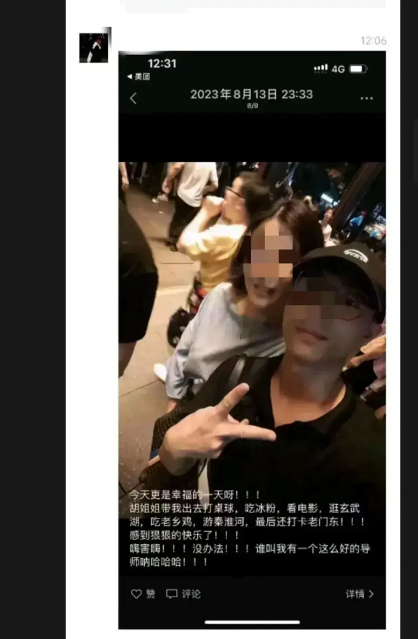 其中一条动态的内容是郑同学感谢胡教授带他吃喝玩乐,他还称呼她为胡姐姐,并配了一张两人的合影。