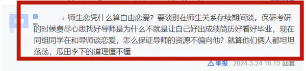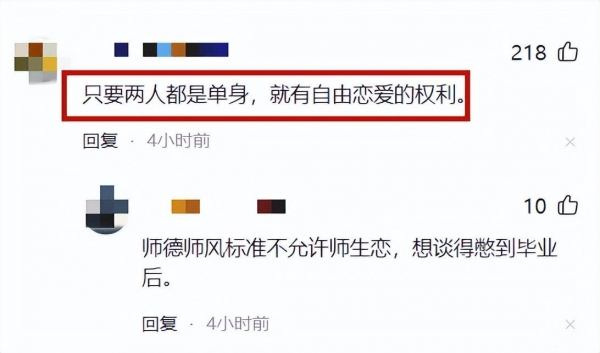这一派的网友认为老师和学生谈恋爱,难免就会有偏袒,甚至会有利益输送,而这对其他学生很不公平。
