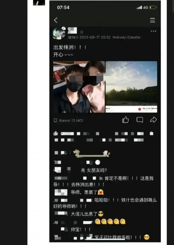 另外一条动态则是两人一起去株洲出差的照片,照片场景是在动车上,两人紧挨着合了一张影,看着十分亲密。