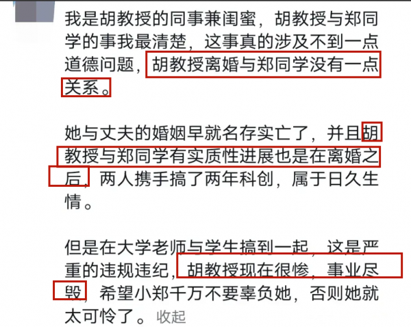 信息一:胡教授没有婚内出轨,她离婚与郑同学没有一点关系。