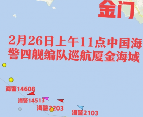 据悉,26日,大陆海警4舰编队:14608-14513-2203-2103,全部进入金门禁止水域线执法,不过这次台湾海巡船未敢出动进行"应战"。从2203船的轨迹看出,大陆海警在金门西南海域反复进出,挑战台当局的"红线",也证明台当局单方面划设的"禁限水域"不复存在。