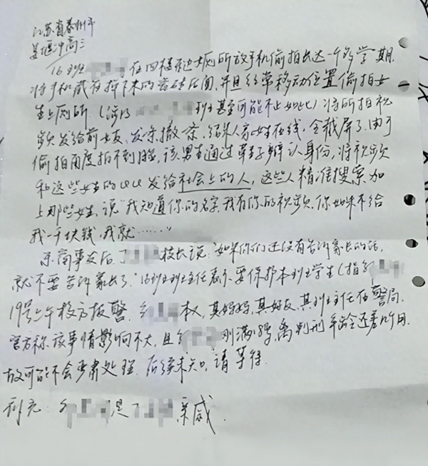 网友发布的一张手写情况说明显示,该男生"将手机藏在掉下来的瓷砖后面,并且经常移动位置偷拍女生上厕所(涉及4个班甚至以上),将所拍视频发给前女友,发一条撤一条,结果人家女生在线,全截屏了。"