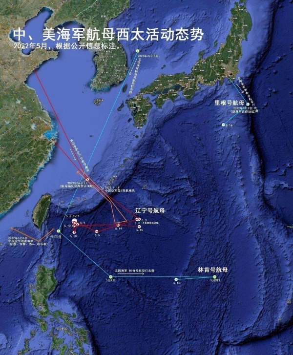 (网友绘制的中美两国航母活动情况,可以看到5月15日和16日两国航母距离其实很近)