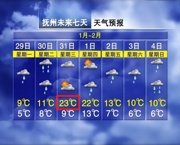 不仅如此气温波动也比较大,呈现出先升后降的趋势,其中抚州到1月31日猛升14℃,最高气温达到23℃,到2月4日又暴跌13℃,最高气温跌到10℃。
