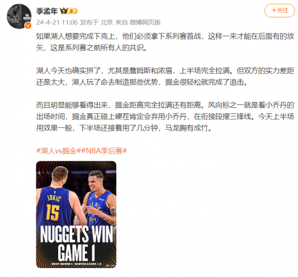 季孟年表示:如果湖人想要以下克上,那么就要赢下G1,这才后面才能有的放矢,这场湖人确实拼了,上半场拉满,但双方硬实力差距太大,湖人玩了命去制造优势,掘金轻松就完成追击。看得出来掘金距离完成拉满还有很大距离,小乔丹都打了8分37秒,碰上硬茬掘金是弃用乔丹的。