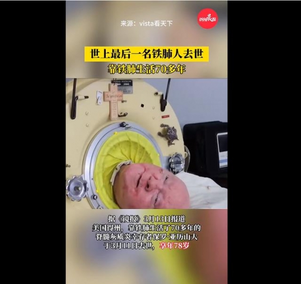 据《镜报》3月13日报道,美国得州,靠铁肺生活了70多年的脊髓灰质炎幸存者保罗·亚历山大于3月11日去世,享年78岁。