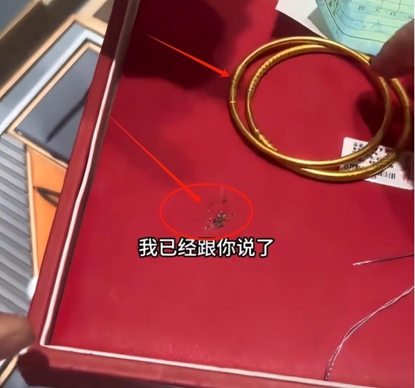看到网友的金镯子,看着镯子里面掉落出来的"泥土",该店的员工也不知道应该说什么,因为的确没有办法解释,对此,店员直接表示:"要不我给你批一下它的折旧,美女,你别冲动。"本身买金镯子就花了不少钱,还遇到这样的情况,这位网友自然是十分生气的,但是好在她是比较理智的,即便生气,也没有闹出太大的冲突。