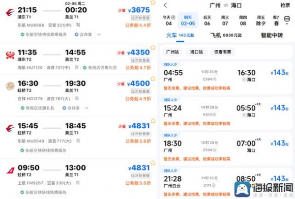 海报新闻记者在出行APP发现,2月5日从上海到海口的机票价格在2100元到4800元不等,并且当日多数航班的经济舱机票已经售罄。此外,海报新闻记者发现,2月5日到2月8日从广州到海口的火车票也全面售罄。
